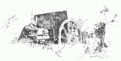 Egy csomó papiros, egy marok ceruza, pasztell-kréta, néhány vízfesték és ecset, az ő elmaradhatatlan esernyője, egy ütött-kopott lóden-köpönyeg, kipróbált, viharedzett szalmakalapja, s hogy teljes legyen a hadi felszerelés, egy rozsdás revolver is lógott az oldalán - - és elment, a csatába.