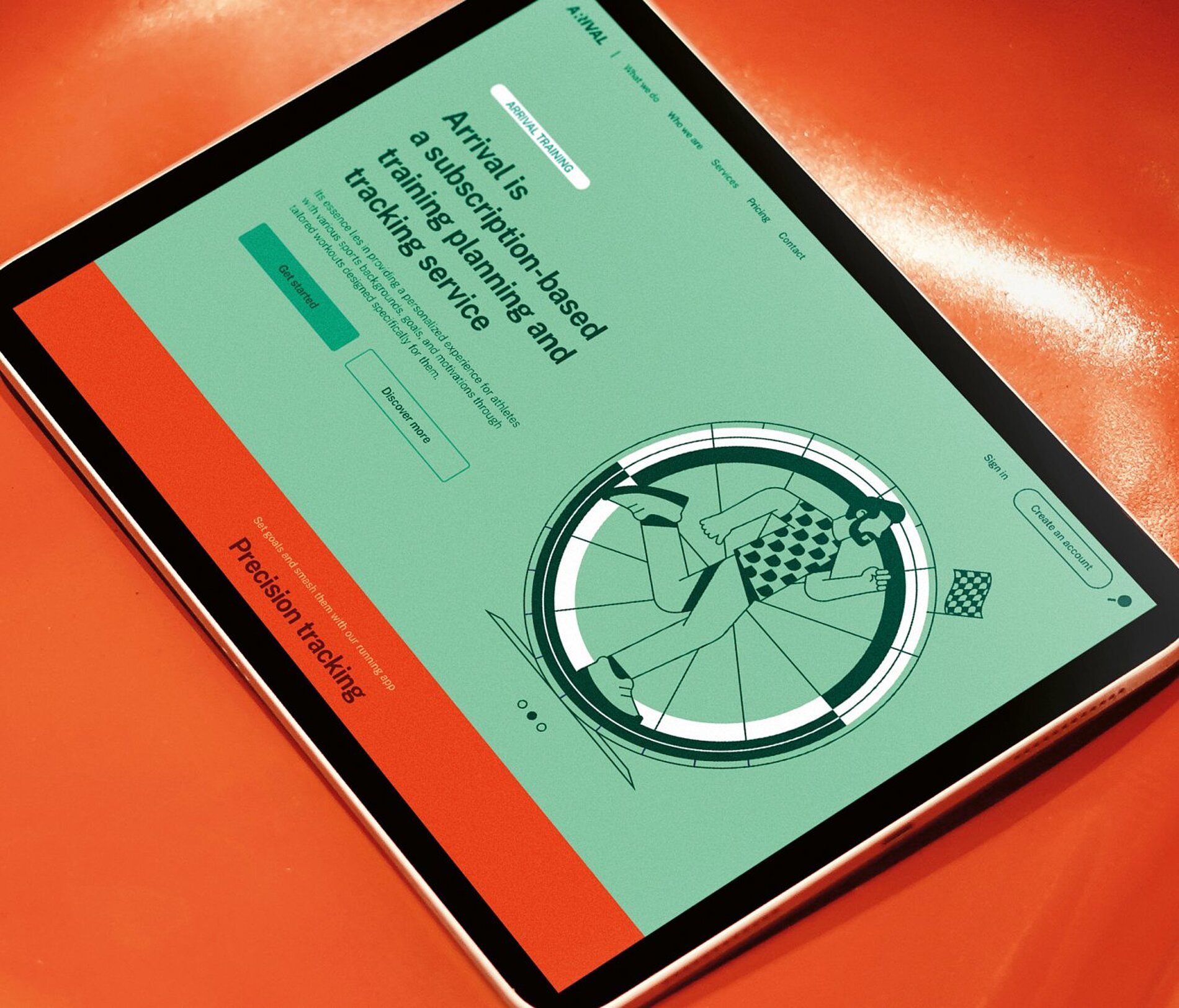 Az Arrival egy online edzéstervező és nyomkövető szolgáltatás amatőr futók számára. A logotípia az „R” betű pozitív–negatív megjelenítésével vizuálisan utal az „érkezés” és a „rivális” szójáték kettősségére. A ferde tipográfia dinamizmust és mozgást kölcsönöz a dizájnnak, míg a logó egyedi dőlésszöge az arculati elemekben is visszaköszön. Ez a karakteres vizuális rendszer egységes és könnyen felismerhető arculatot teremt a márkának.
