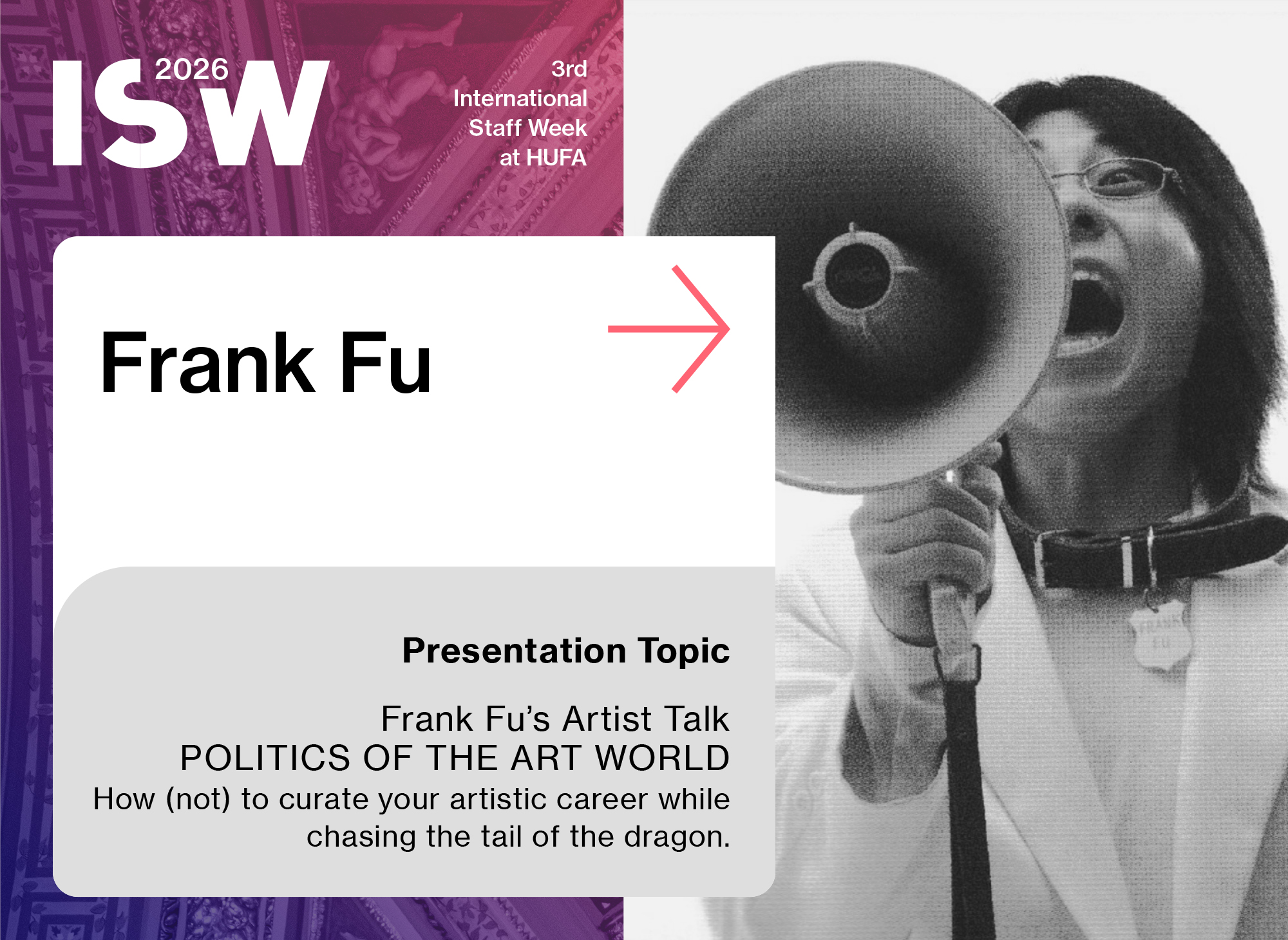 Born in Inner Mongolia, China, Frank Fu is a contemporary artist whose works challenge the white-box setting of galleries, museums, and cinema. His endurance performances and films examine his identity as an artist, often commenting on the politics of the art world. He has conducted performances at the Venice Biennale, Documenta, Sydney Biennale, Asian Contemporary Art Fair (New York), Asian Contemporary Art Week (New York), Rubin Museum of Art (New York), Luxehills Museum of Art (China), along with the Centre Pompidou and Louvre Museum (Paris). His films have premiered at the prestigious Locarno Film Festival, Visions Du Réel (Switzerland), and Transcinema (Peru). Most recently, Frank Fu, the “grandson of performance art”, has been selected to perform for Marina Abramović, the “grandmother of performance art,” for her lifetime retrospective exhibition in Zürich. Frank Fu has been featured on national television networks and mainstream media outlets, including Netflix, NHK (Japan), CCTV4 (China), the New Zealand Herald, the New Zealand Listener, Perú 21, La República (Peru), and The National Business Review. He has also been featured in major contemporary art publications, including ARTCO (Taiwan), The White Hot Magazine, Bloomberg’s Tate Shots (UK), and Frieze Magazine. Frank Fu is the Head of School at F.U. INSTITUTE and the founder of Performance Art Los Angeles.