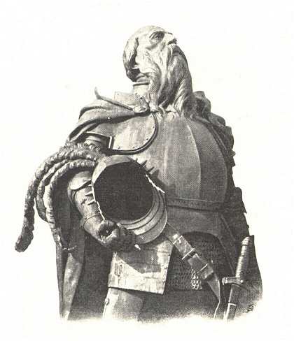 A paripa szügybe szegett feje mögött, -szinte deréktól kezdve látjuk a király hadverő alakját. Magasan domborodó páncélja alatt érezzük a testet, dobog a szive, él. A legkü-vetelőbb naturalizmus se találhat hibát rajta, pedig a lehető legstilizáltabban, hogy úgy mondjuk, szobrosan ül nyergén ; helyesebben, feszülő térdekkel áll a kengyelben. Feje, arcéle nem szelíd: fönségesen erős, imperátori. Ilyen testtartása is.