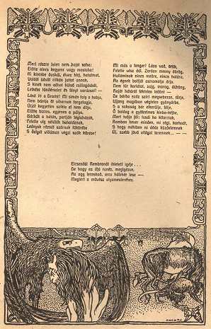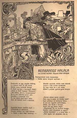 NAGY SÁNDOR rajzolta első mellékletünk képdíszét Lenkei Henrik "Rembrandt halála" című költeményéhez. Ugyanennek a művésznek műve a 8-ik oldalon közölt "Vízcsöpp-Társaság plakátja" című rajz.