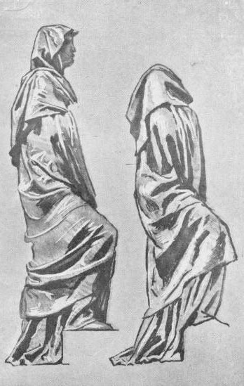 Székely Bertalan, a nagy freskók mestere, itt közölt, aránylag kisméretű rajzai szintén nagy művek előtanulmányai, amelyek gondos elmélyedés és mélyreható tanulmány dolgában szinte páratlanok. Mutatják egy mester felkészülését nagyszabású dekorativ feladatok megoldására. A nagy sorozatnak csak néhány darabját mutatjuk itt be, hogy a közönség belelásson az előkészítő munkába, amelynek végső eredményeit nagy freskóiban bámulhatta. Egyazon alak kiformálása a cél s az adott esetben Székely Bertalan minden gondját arra irányította, hogy az alak mozdulatát mentül jobban kiemelje, hangsúlyozza a drapéria, amely elfödi. Székely kezén a drapéria nem volt soha valamely közvetlenül lefestendő objektum. Ha a drapéria rendesen elfödi a test kifejező mozdulatait, szerves tagozatát: Székely azon dolgozott, hogy a. drapériát is úgy alakítsa, hogy az nem hogy elburkolja, hanem inkább kiemelje a törzs fordulatát, a tagokat. Neki ez eszköz volt egy mozdulatmotivum kiemelésére s hogy ez az eszköz mentül engedelmesebb legyen, képeinek minden egyes alakjához előbb sokféle változatban rajzolt drapéria-tanulmányokat, míg végi s a redők járását és esését úgy tudta rendezni, hogy kitűzött kompozicionális célját elérje. E rajzok bizonyára kitűnő ujjmutatások e nagy mester kompozícióinak megértéséhez s reprodukciójukat bizonyára szívesen veszik az érdeklődők.
