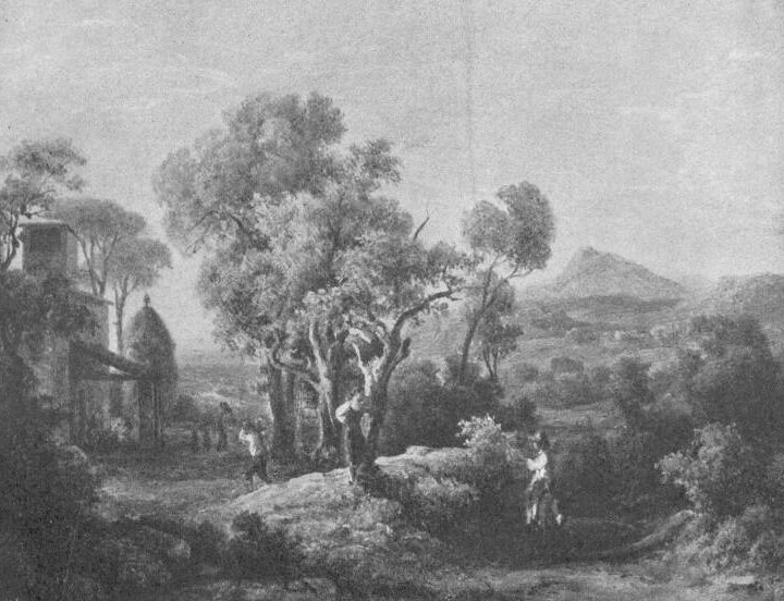 A középen erőteljes facsoport (vén olajfák), jobbra egy mély úton át messzenyúló völgyet látni, e mögött mozgalmas vonalú hegység, balra egy vigna, kazallal. Néhány paraszt alakja élénkíti az egész képet. A legfinomabb miniatura-festés, gyöngéden hangolt, gazdag színezéssel. A mester halála évéből való mű.