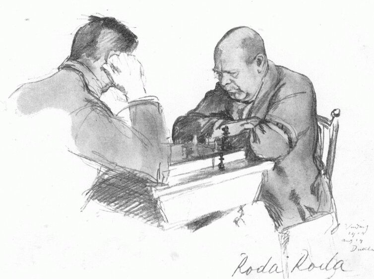 Láttunk tőle rajzokat, melyekben a dúló szenvedélyek levegője izzik. Ha mostani rajzainak egy részében a lehangoltság, a szomorú hangulat uralkodik, annak okát két momentumban kell keresnünk: az egyik az, hogy épen ezek iránt a hangulatok iránt a legfogékonyabb a müvészlélek, a másik pedig az, hogy a művésznek, akinek ezek a rajzai a látottak közvetetlen benyomása alatt készültek, az ütközetek hevében részt venni eddig alig volt alkalma.