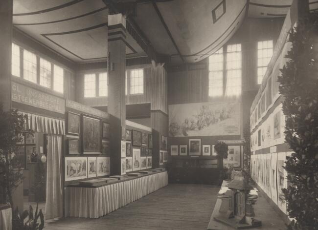 55. Weinwurm Antal [?]: Az 1912-es drezdai 4. Nemzetközi Művészetoktatási, rajzolási és alkalmazott művészeti Kongresszus (IV. Internationalen Kongress für Kunstunterricht, Zeichnen und Angewandte Kunst. Dresden, 1912 ) kiállításának magyar szekciója, 1912. - A bal oldalon a Kovách Géza tanár által összeállított mappák.