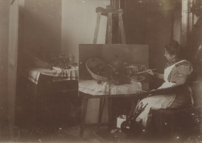 80. Csendéletet festő nő. In Magyar Kir. Női Festőiskola: fényképek a növendékekről munka közben és az iskola alaprajza, j Ecole Roy. Honr. de Peinure pour Dames. Lés élevés pendan le ravail et plan de l'école, [s. n.], [Budapest], [ca. 1900]