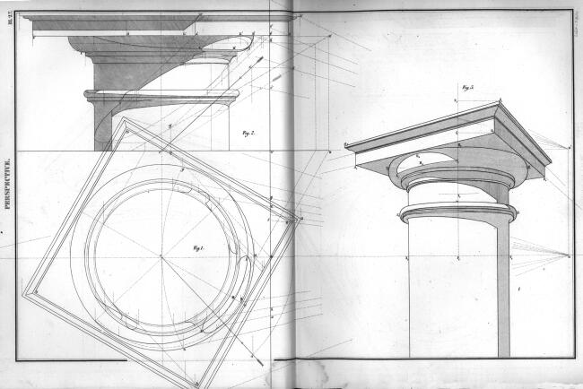 129. Oszlopfő merőleges vetületei és perspektivikus képe árnyékszerkesztéssel. In Leroy, G: Atlas zu C. F. A. Leroy's Stéréotomie. Stuttgart, 1861. Bl. 27.