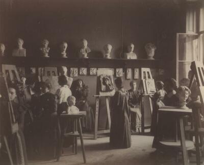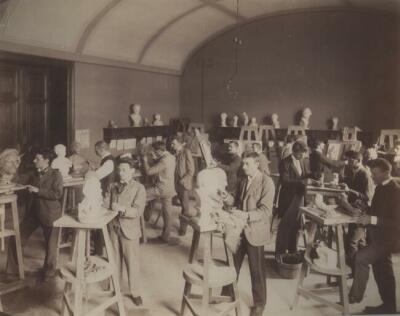 A szobrászat oktatása kezdetben elsősorban az alaki és ékítményes mintázásra szorítkozott, jóllehet első tanára 1875-ben bekövetkezett haláláig Izsó Miklós, az ő utóda pedig 1885-ig HUSZÁR Adolf volt. Tanulmányi munkák - valószínűleg tárolási nehézségek miatt -nem maradtak fenn, így az iskolában folyó oktatásra a tantervekből és néhány fotográfiából következtethetünk. 1878-1879-ben a tantárgy leírása a következő: "Mintázási gyakorlatok, különösen domború ékítményes minták, valamint az emberi fő és az emberi test egyes részeit ábrázoló domború és teljes alakú főszminták nyomán. Hovatovább ékítményes gyakorlatok összetettebb rajzok szerint, valamint figurális mintázatok élő fejminta vagy egész alakról, féldomború és teljes alakú végrehajtással (relief és ronde bosse). Bonczalaktani mintázatok, iparművészeti tárgyak másolása s önálló tervezetű mintázatok." A mintalapok, a domború ékítményes reliefek, vagy a gipszek utáni mintázás lényegében a másolt mintákhoz igen hasonló "mintaanyag" létrehozásához vezetett, amint ez a mellékelt, 1896-os fényképfelvételeken is látszik. Az oktatásban így a minták és a növendéki munkák vonatkozásában egyfajta ökonomikus recirkuláció valósulhatott meg. 1885-ben STRÓBL Alajos lett a tantárgy tanára, s ettől kezdve azok a növendékek, akik "a plasztikában alaposabb készültséget kívántak szerezni", a gipszöntést és az agyagégetést is gyakorolták. 1889-1890-ben a mintázási osztályt az Epreskertben időközben felépült, Gerster Kálmán tervezte szobrászati műteremben helyezték el, amely kezdettől fogva "szobrászati pályára törekvő művésznövendékeket is befogadott". 1890-1891-ben a rajztanárjelöltek és a művésznövendékek szobrásztanulmányait - a tanár- és a művészképzés általános kettéválasztását (1897-1898) jóval megelőzve - elkülönítették. Az előbbiek tanára LORÁNFI Antal lett, aki az iparművészeti iskolában a kisplasztika rendes tanára volt. Stróbl a művésznövendékek szobrászképzésével foglalkozott: a szobrásznövendékek antik és élő minta után fej- és egész alakos akttanulmányokat, valamint állattanulmányokat és önálló kompozíciókat készítettek. 1897-ben a Stróbl Alajos vezette szobrászati osztály mint öná-ló mesteriskola kivált az anya intézetből. Ezután Loránfy Antal tanította a mintázást az összes növendékeknek. 1902-1903-ban a mintázást "mint a formaérzéket igen fejlesztő melléktantárgyat" a harmadik osztályra is kiterjesztették, az élő emberi alak (akt) mintázására nagyobb súlyt helyeztek. A növendékek ezenkívül élő növény-, állat- és akttanulmányokat is folytattak. 1905-ben a távozó Loránfy helyét egykori tanítványa, az 1894 és. 1903 között FadruszJános mellett segédként dolgozó RADNAI Béla foglalta el, 1911-ben pedig BORY Jenő lett a mintázás segédtanára. A főiskola megalakulása után, az 1908-1909-es tanterv szerint a rajztanároknál "a mintázás nem a szobrászati tökéletesség szempontjából gyakoroltatik, hanem elsősorban s legfőképp a formai és plasztikai érzék fejlesztése céljából".