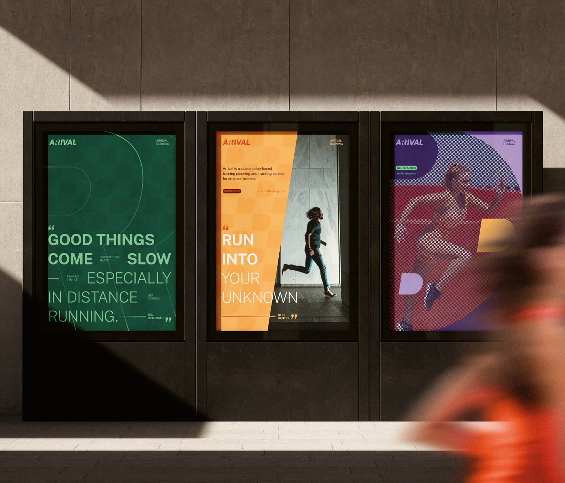 Az Arrival egy online edzéstervező és nyomkövető szolgáltatás amatőr futók számára. A logotípia az „R” betű pozitív–negatív megjelenítésével vizuálisan utal az „érkezés” és a „rivális” szójáték kettősségére. A ferde tipográfia dinamizmust és mozgást kölcsönöz a dizájnnak, míg a logó egyedi dőlésszöge az arculati elemekben is visszaköszön. Ez a karakteres vizuális rendszer egységes és könnyen felismerhető arculatot teremt a márkának.