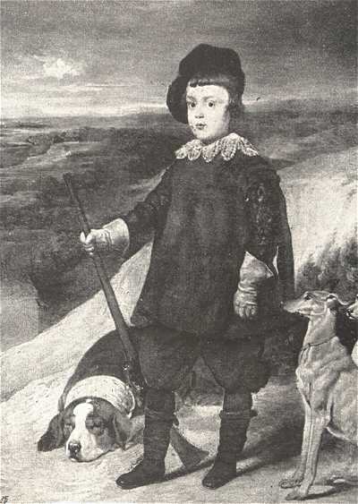 Az első teremben kétségtelenül a Benczúr Gyula birtokában levő, Velazqueznek tulajdonított kép köti le figyelmünket, a melynek mását ebben a számban találja az olvasó. Sokat vitatkoztak már a felett, ha vajjon ez a kép a nagy spanyol művész sajátkezű műve-e. Tárgya, mint azt a szakértők jól tudják, teljesen megegyezik Velazqueznek Baldassare hercegről festett s a madridi Pradoban levő ösmert képével, a melynek azonkívül több másolata is létezik. Mivelhogy ez a kép kétségtelenül regi s egész kezelése Velazquez korára utal, csak azt a kérdést kell eldönteni, vajjon a mester által készített másolattal van-e itt dolgunk, avagy oly munkával, a melyet a mester műtermében valamely tanítványa vagv segéde készített. Összehasonlítván ezt a képet a madridival, kitűnik, hogy példányunk a jobboldali szegély kivételével valósággal szolgai másolata az eredetinek. Ez már magában véve is föltűnő s arra kényszerit következtetni, hogv kevésbbé a mester, mint inkább valamely segédjének kezemunkájával van dolgunk. Megerősíti ezt a véleményt a jobboldali szegélyrész elváltozása. Az eredetin ezen a helyen fa áll, mögötte annak a kutyának egy része, a mely képünkön is látható. A fa helyét a mi példányunkon egy agár foglalja el, de közepes minőségű, kemény merev előadásban, a mely éles ellentétben van a kép többi részével. Itt abszolúte világosan megismerszik egy közepes másoló keze. Ugyanerről tanúskodik a kép általános tónusa, a mely nélkülözi azt az ezüstös zománcot, a melyet Velazqueznél megszoktunk, azonfelül pedig kemény és éles. Bár mindez Valazquez szerzősége ellen szól, mégis be kell ösmernünk, hogv az arc bizonyos részei és a nyak csipkedísze oly kitűnően van megfestve, hogy éppen nem sértenők meg Velazquezt, ha itt az ő közreműködését tételeznők fel.