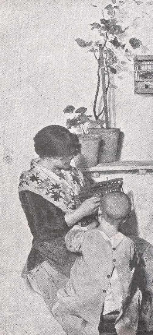 A Torinóba küldött másik kép ; a "Metszetek és könyvek" szintén érdekes lap a modern Venezia életéből. Valamelyik kisebb piacon, ruhával leterített hosszú asztalra rakta ki könyveit az öreg ószeres. Kopott kötésű, régi nyomtatványuk ezek s meg vannak sárgulva és szakadozva a metszetek is, melyek szép sorjában egymás mellett a falon függnek. Az asztal egyik végénél, kendőjébe burkolva, öreg asszony ül, a másiknál, háttal a. nézőnek, kopott kabátos öreg úr (talán a művész atyja ?) telepedett le s valamely érdekesebb munka lapozásában van elmerülve. A kép közepén, egy fiatal leány s előtte két pap fekete alakja köti le figyelmünket. Közönséges, gyakran látható jelenet; de a két sötét pont a háttér világos részeiből művészi módon emelkedik ki és szélesebb, erőteljesebb hátteret már képzelni is alig lehetne.