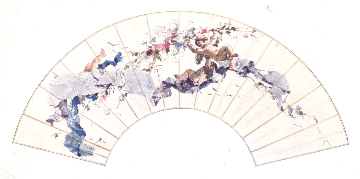 Favrettónál jobban kevés művész ismerte és szerette a XVIII-ik századot. A mint Guardi és Longhi festményei a szabadosán vidám korszak embereit és erkölcseit szemei elé varázsolták s Goldoni vígjátékaival, Burati gyakran frivol de mindig kecses verseivel megismerkedett, álmaiban csak csipkekendőt viselő, előkelőén könnyelmű Watteau-hölgye-ket, spádéval, hajporos parókával, színes kabát-tal és jól gondozott lábikrákkal büszkélkedő uracsokat látott. Mint Parisban a Goncourt-test-vérek, ő is csak akkor érezte magát boldognak, ha a veneziai modern élet mindennapi szürkeségéből ezek társaságába menekülhetett. Nem könyvekből, hanem a kor reánk maradt emlékeiből tanulmányozta őket. Eveken át az amateur szenvedélyével és kitartásával kutatta a régiségkereskedők boltjait, a pusztulásnak indult paloták lomtárait, hogy magának beszédes környezetet teremtsen azokból az emlékekből, melyek e poetikus korszak szellemességét s könnyed életfelfogását hirdették. Műterme ekképen valóságos múzeumává lett a régi bútoroknak, kacér formájú aranyos tükröknek, selyemmel hímzett férfi és női öltönyöknek, keztyűknek, legyezőknek, színes harisnyáknak csattos cipőknek. A falakon perzsa szőnyegek, gobelinek; a szépfaragású polcokon bronztárgyak, régi majolikák s a szivárvány színeiben játszó muranói üvegek; az állványokon olasz mesterek eredeti képei és drága színes metszetei; az egyik sarokban különös formájú hangszerek, a másikban hatalmas antik óra, melynek gépezete valamely kisebb faluban az összes lakosság számára szolgálatot tehetett volna. Az egész környezet a leviharzott, régi jó időkre emlékeztetett. Favretto előtt minden apró tárgynak, szövetdarabnak és rongynak megmérhetetlen becse volt, mert ezekből a lomokból az elmúlt világ hangjai szólottak hozzá. Később Tiepolo vidám, ragyogó színeit, szabad komponálási modorát, merész rövidítéseit kezdte tanulmányozni. Szellemében a Villa Valmarana képeinek gyűjteményéhez Ongania megbízásából címlapot készített s közönséges veneziai vászonlegyezőket népesített be rózsákat hintő Flórával, virágfüzéreket tépdeső kövér amorettekkel, melyek alá odajegyezhette volna a nevét maga Giambattista Tiepolo is. Két ilyen legyezője van gyűjteményemben ; mind a kettő fényes bizonysága szelleme nagy befogadó képességének és bámulatos rugékonyságának.
