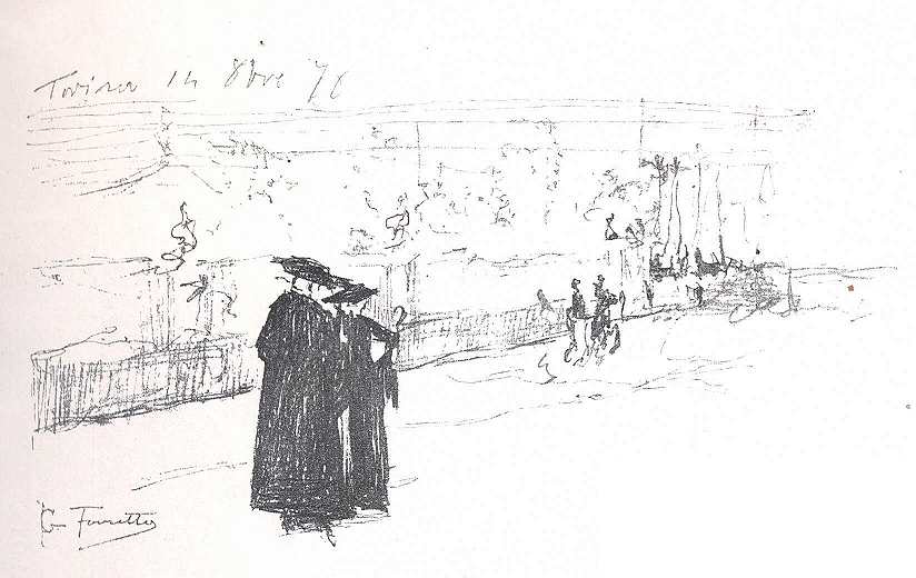 Az 1880-diki turini kiállításon Favretto a közönség általános érdeklődését, sőt csodálkozását vonta magára. Ezúttal már nem marad a zárt szobában, kilép a szabad természetbe, a csodás világosságú kék olasz ég alá. Itt érezi magát egészen elemében, itt mutatkozik be a maga sajátos művészi arculatával. És a vene-ziai ég szelíd azúrja alatt pezsgő élet minden kincsét fölfedezi művész fiának. Favretto most már mindent élesen és biztosan, lát és sohasem kicsinyesen. A modern festők színpadi Veneziája helyett az igazi Veneziát festi a maga kendőzetlen szépségeivel.
