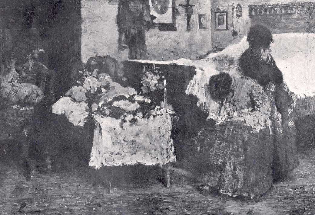 Műértők és laikusok büszkeséggel vegyes elragadtatással zarándokoltak a Favretto vásznai elé, míg egy júniusi nap délelőttjén váratlanul gyászfátyollal bevont koszorúkat találtak a fiatal mester élettől és erőtől sugárzó festményei előtt. Favrettót, ki pár év előtt még egyik szemének elvesztésekor hősies bátorsággal állta ki a nehéz műtétet, korai sírba sodorta egy eleinte jelentéktelennek tartott betegség. Midőn a boldogság teljes fényében mosolygott reá s oly módban élt, hogy magának és családjának minden kényelmet megszerezhetett, akkor kellett megválnia az élettől, melyet méltán szeretett; szülőitől, kik támaszukat bírták benne s barátaitól, kiknek egyszerre testvérük és mesterük volt. . Mikor ama végzetteljes júniusi reggelen váratlan halálának híre a kissé távoleső san-cassianói negyedből a város mozgalmasabb pontjaira megérkezett, senki sem akart hitelt adni a Hiób-posta jelentésének. Olyan szokatlanul, olyan hihetetlenül hangzott, hogy Giacamo Favretto - nincs többé. Hát lehetséges meghalni, mikor a tehetség egész erejében tündököl, mikor a szívben és az agyban oly élénk vágya él az alkotásnak ? Nem kegyetlenség-e a sorstól, hogy valakit ma összetiporjon, midőn tegnap még annyi szeretettel mosolygott reá ?