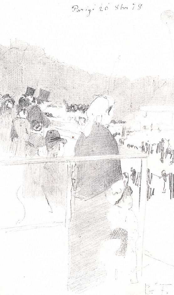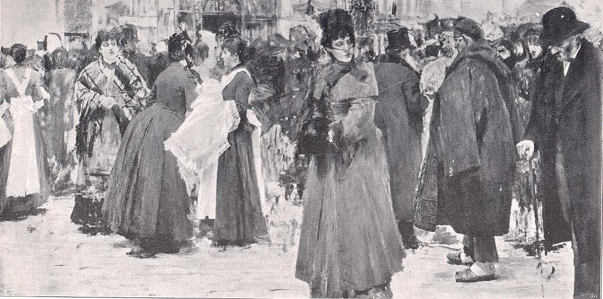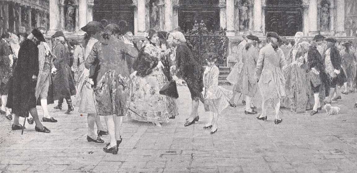 Ugyanekkor a múlt század utcai életének tanulmányozását is folytatta, két napfényes képen. Az egyik a Porta della Carta előtt, a másik a ponté della Paglia lépcsőin mutatja be Venezia előkelő urait, a mint egymást kimért bókkal üdvözlik vagy bizalmas társalgásba merülnek. Mind a két képről a régi társadalom vidámsága, felületessége és ledér-sége szól hozzánk. Ennyi igazsággal csak Longhi jellemezte századának elegáns és ledéi-alakjait.