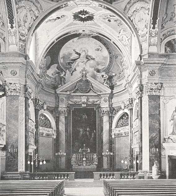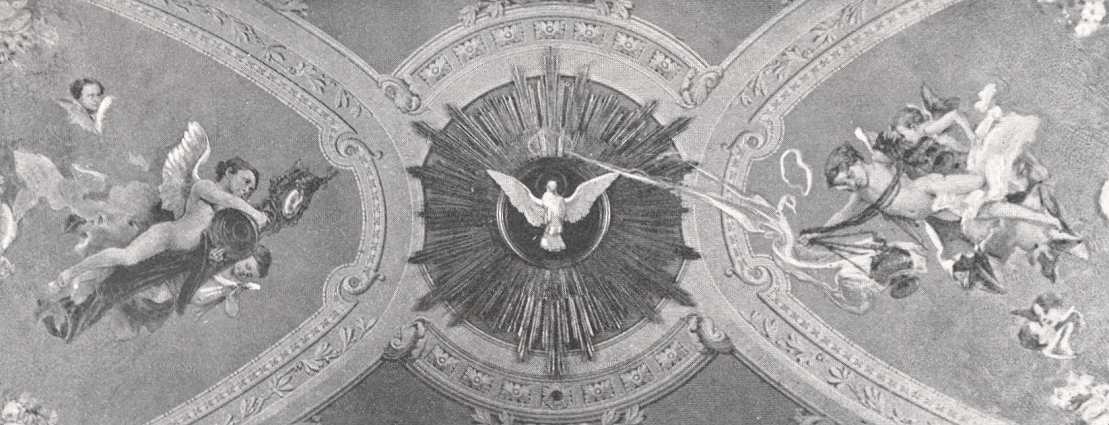 A KECSKEMÉTI NAGYTEMPLOM FRESKÓI AZ ATYAISTEN A SZENTÉLY ÍVÉN ROSKOVlCS IGNÁC FESTMÉNYE