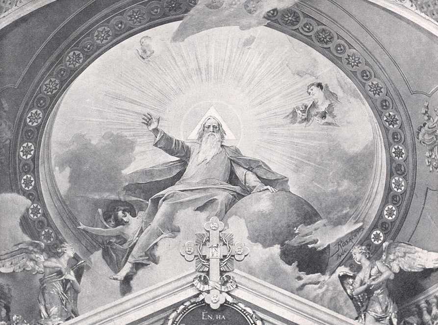 Nyilvánvaló az a céltudatosan választott s nagy festői érzékkel keresztülvitt intenciója a művésznek, mely míg egyrészt gazdag skáláját nyújtja a szín- és fényárnyalatoknak, másrészt az Atya Istent, mint a fény és világosság forrásában trónolót tüntetve fel: vallásfilozófia szempontjából is erős és biztos alapra helyezi tervezetét.