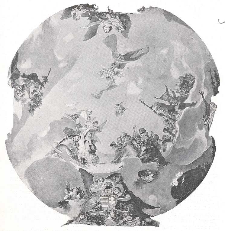 A kupola felső részén az Árpádok címerét tartó angyalok lebegnek. Alattuk a peremen emlékkövet (a szent év számát s a festés idejét jelezve) tart egy angyal, míg egy másik az emlékkövet borostyánnal övezi.