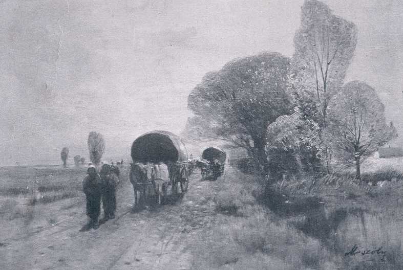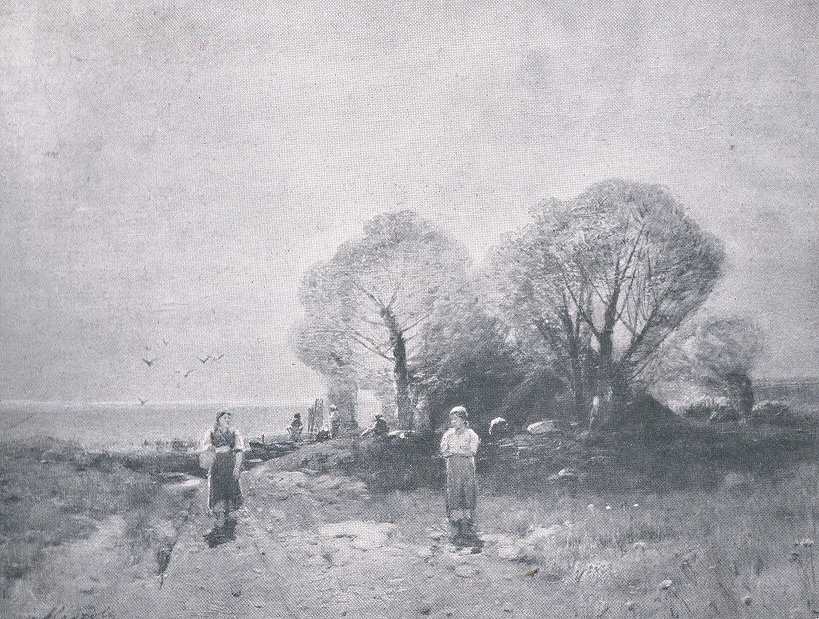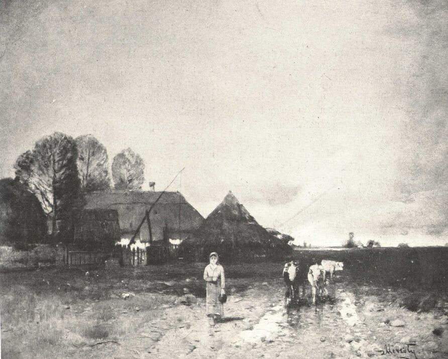Amikor csak tehette, jött haza az Alföldre, a Tisza mellé, a magyar tenger partjára ; jegyzeteit itt készítette, lelke itthon fürdött meg új impressziókban, vázlatkönyvébe itt találta meg a tájképbe helyezett zsánerekhez a típusokat, - - így azután idegenben se lett idegen. És mintha hálás akart volna lenni hűségeért az anyaföld, éppen ezek az itthon talált kis dolgai segítették sikerre már Bécsben : ő lett az akadémia egyik kitűnősége s képeit szívesen vásárolták a bécsiek.