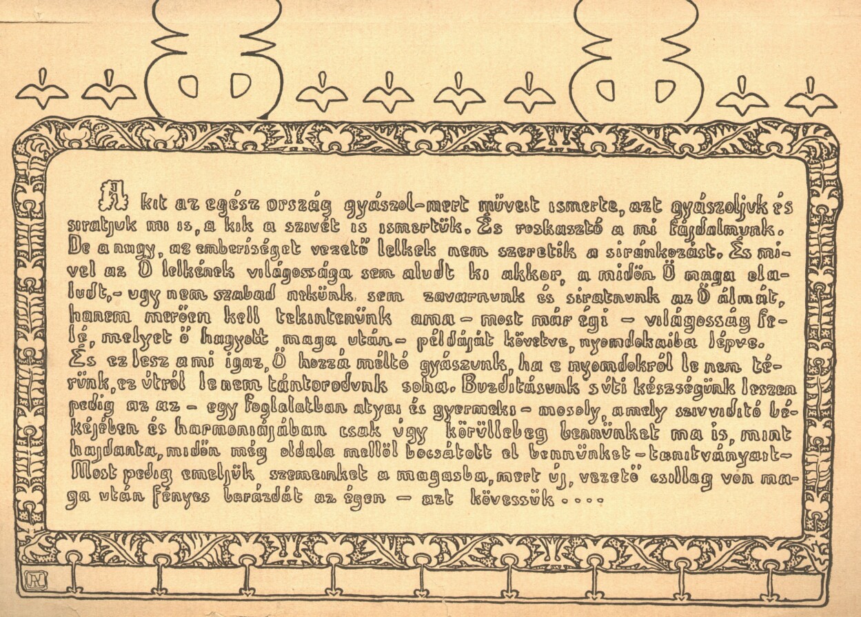 És íme, mindig többen és többen látják benne a követendő példaképet és a benne rejlett páratlan jóság még mintha sírjából is kisugározna felénk, mindig többen vagyunk, akik az ő iránti tiszteletben és szeretetben egymással találkozunk és a fájdalmas rezignáció-ban valami jóleső melegséggel kérdezzük egymástól, hát te is itt vagy, te is szeretted őt? És ha ellentét van is közöttünk felfogásban és gondolkodásban, ha őt együtt szeretjük, egymásnak sem lehetünk idegenek. Az ő emléke összeköt bennünket a művészi fejlődés a kulturális törekvés kezelésében.