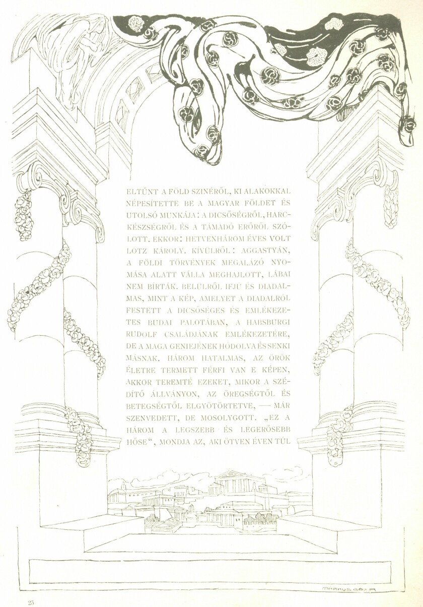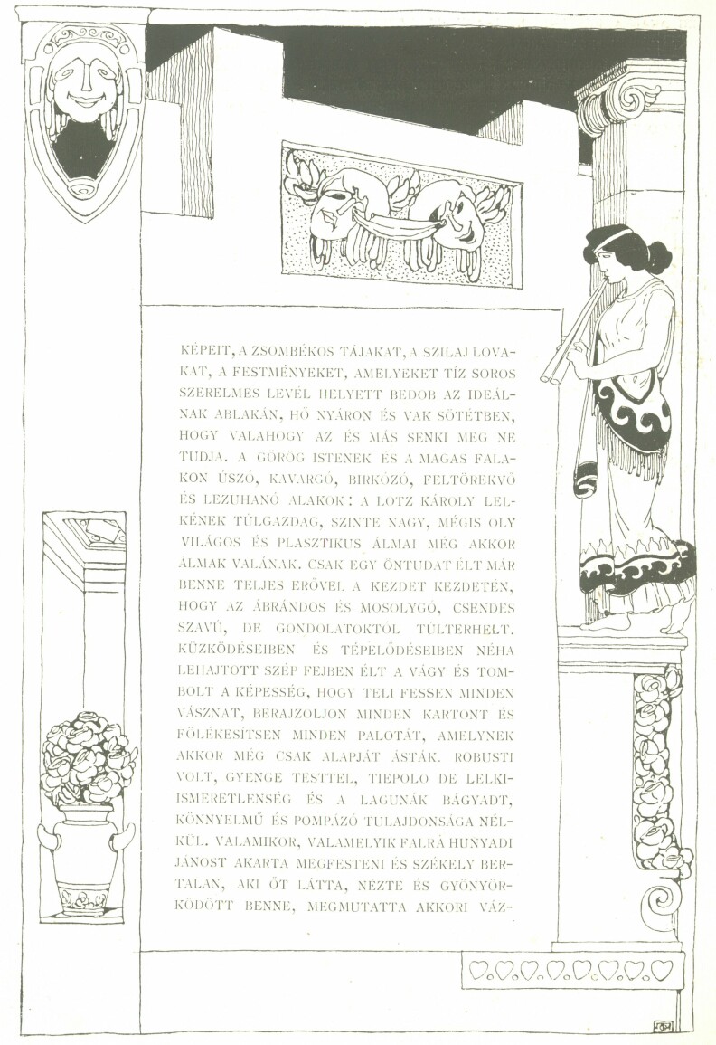 Mert ez a magyar faj, minden népek között a legbrilliánsabb, minden nemeset a leghama-rabban átérző, zseniális faj, megmagyarázható okokból, - - Lotz korában, majdnem egészen értelmetlen annak megítélésében, mennyiben nélkülözhetetlenül szükséges alkatrésze az államalkotás kiépítésének, ipari és kereskedelmi fejlődésének, a nemzeti élet gazdaggá és naggyá tételének az általános művészi nevelés, és ennek híján teljesen tájékozatlan a művészet értékének megítélésében. Nem a faj hibája ez. Oka egyszerűen az, hogy neveléséből a nevelésnek ezen része hiányzik és ezzel hiányzik az a kapcsolat a művész és közönsége között, amely kapcsolattal együtt fejlődhetik csak a művészet úgy, hogy az az államélet közhasznú tényezőjévé váljék.