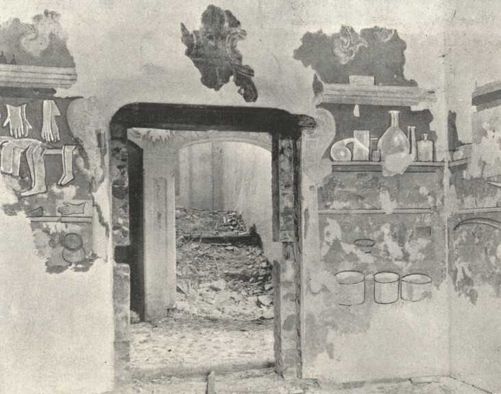 A szoba kosárboltozatán, a száraz falra festett képekből, már semmi sem látszik itt. Annál frissebb állapotban maradt meg az oldalfalak illuziós díszítése, mely véges-végig deszkapolcokat ábrázol, különbnél-különb tárgyakkal megrakva, amelyekkel a fejlődő gyermek eszének legkorábban kell megismerkednie. Faragó gyermekek számára festett képeskönyvének másfél száz év előtt készült monumentális kiadása e gyermekszoba, mely, azt hiszem, külföldön is párját ritkító kulturhistóriai érdekesség. S a polcra helyezett lombik, pohár, palack, kalap, cipő, a deszkákról lecsüngő harisnya, nadrág, kesztyű s egyéb ruhadarab képe rendkívül gonddal van megrajzolva. Körvonalai a nyirkos falba vésvék, árnyalása valamennyi tárgynak mesteri. Igen jellemző festőnkre nézve, hogy a legnagyobb gonddal a gyermekeknek szánt képein dolgozott.