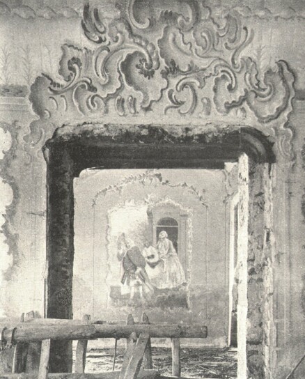 Az oldalfalakat itt fülkékben ábrázolt festett allegorikus szobrok díszítik, a kastély legsilá-nyabb festményei. A legérdekesebb szoba tagadhatatlanul a földszinti gyermekszoba volt, amelyet már régen bemeszeltek, amelynek díszítését azonban, amennyire időm engedte, legalább részben sikerült a meszelés alól kihámoznom.