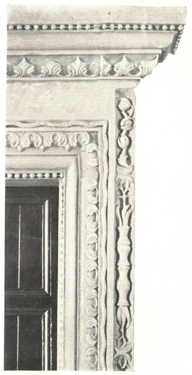 A másik emeleti ajtókereten a díszítés elemei gyöngyök, durvábban faragott levelek, a külső horonyban ismét sajátságosán alakított baluszterek sorából állanak. A középső léc külső szegélye legalyazott ágfonadékával elkorcsosult gót stilű ékítmény. Az ajtófelek szélén levő horonyban sorakozó s kettős fantasztikus virágokban végződő baluszterek motívumát megcsonkítás- nélkül az ajtókeret felső sarkáig nem vezethette mesterünk s azért itt úgy segített magán, hogy három hasadt burokkal bíró dióalakú elemmel töltötte ki a horony felső hézagát. (Képét 1. 99. 1.)