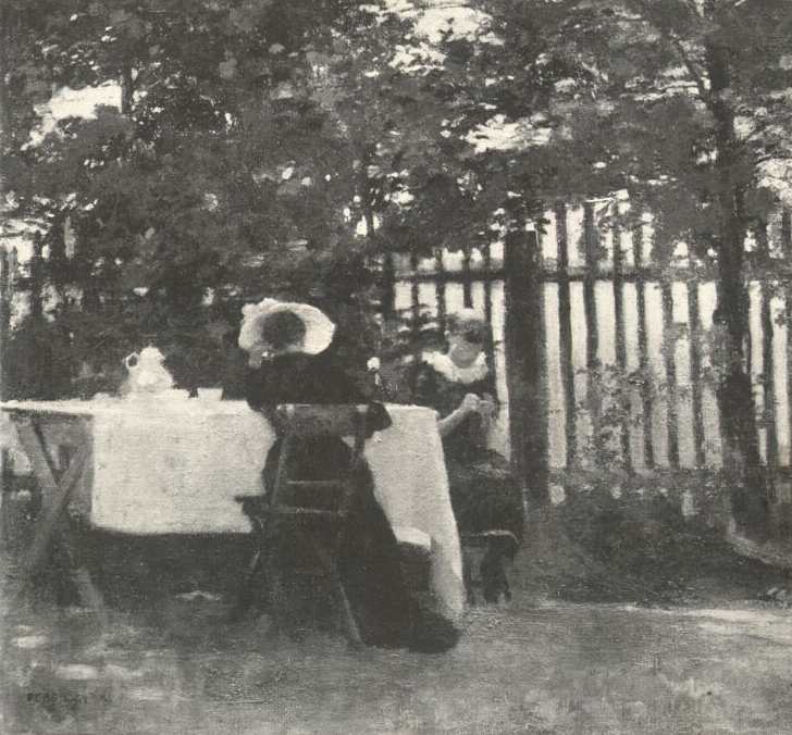 Az "Ádám"-on a természet is föllép a háttérben, de csak mint járulék; az emberi alak kiválik belőle s uralkodik rajta. A következő évben, az ezredéves kiállítás nagy tárlatán, Ferenczy három új képet állított ki; köztük a "Kerti jelenet" című olajfestményt. E mű a müncheni négy év eredményeinek foglalatja. Nem elemzés többé, hanem a formáknak megfelelő foltok biztos összeszerkesztése; nem ember és természet kettéválasztása, hanem festői egybefoglalása. E kis feladatban sikerült már a művésznek az, aminek nagyban való megoldása mé g néhány évi munkájába fog kerülni.