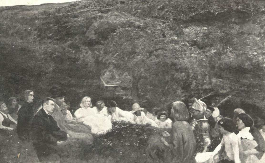 Első nagybányai bibliai képe volt a "Hegyi beszéd", 1897-ből. Valami kettősség érezhető benne: a Krisztust hallgató alakok megkapó csoportja s a háttérben emelkedő erdős hegyoldal közt. Két külön kép : München és Nagybánya. Münchenből még úgy jött haza, mint akit a természetben az ember érdekel legjobban. A nagybányai élet eltávolította kissé az embertől, s közelebb hozta a nagy természethez. Az ottani gazdag természet megragadta szemét és kedélyét; számos táj-, különösen erdőtanulmányt festett, melyek a nagybányaiak kiállításain tűntek föl. A természet helyet követelt történeti kompozícióján is, de a "Hegyi beszéd "-ben még nem olvadt vele egységgé. Viszont követelődzése már elég hangos, s nem elégszik meg másodrendű, kisérő szereppel. Az ember és a természet küzdenek egymással e képen. Ha Ferenczy eddigi fejlődését figyelemmel néztük, nem lehet kétségünk, hogy nála a természet fog győzni, s az embert annak alá fogja rendelni.