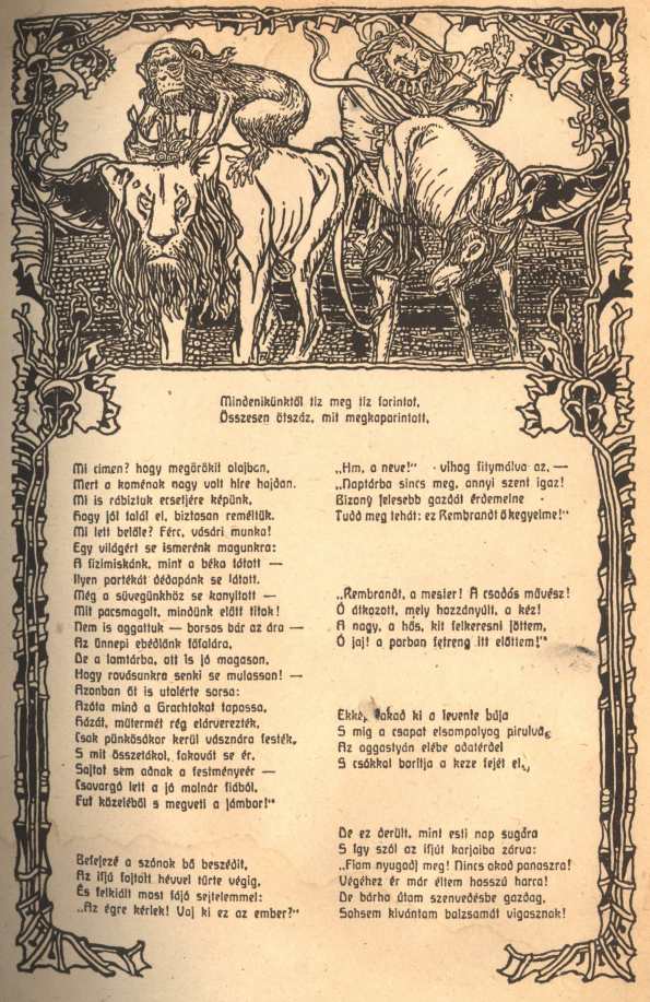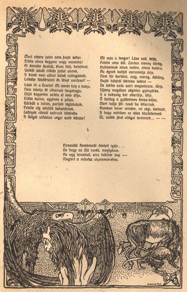 NAGY SÁNDOR rajzolta első mellékletünk képdíszét Lenkei Henrik "Rembrandt halála" című költeményéhez. Ugyanennek a művésznek műve a 8-ik oldalon közölt "Vízcsöpp-Társaság plakátja" című rajz.