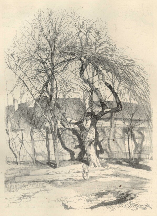 Egy kisebb, intim magyar kiállítást is láthattunk itt pár napig, Hollósy Simon iskolájának kiállítását. Örvendetes frissességet és törekvést találtunk a két teremben, melynek faláról hunyadmegyei és máramarosi tanulmányok, a felső Tisza dombvidékének kedves motívumai tarkállottak. Közöttük Hollósy régebbi tanítványainak, Glatznak, Thormának, Ferencynek egy-egy finom stúdiumát is megtaláltuk, Siposs gyöngéden érzett aktjait s egy úgy hangulatban, mint kezelésben fátyolfinom grisaille-t Kubinyitól. Hollósy, ki maga néhány önfeledt, a népdal mélaságát lehellő tájképpel volt képviselve, e kiállítással jogos elismerést szerzett művészpedagógiai vezérmotivumának: hogy a művészt csakis a természet jelenségeinek egyszerűségben és mélységes bensőségben való átérzése teszi művészszé, hogy műve nem más, csak visszhangja egy felé szálló megnyilatkozásnak.