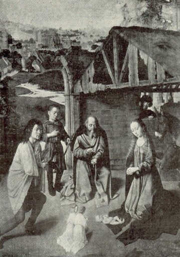 Gerard Dávid hollandiai származású művész, ki azonban éppen akkor telepedett le Brüggében, midőn Memling, kinek legnagyobb tanítványa lett, a Johannis-hospitalban dolgozott. Nálunk látható és Krisztus születését ábrázoló képe azon időből való, midőn még a hollandi mesterek, Dirck Bouts, Geertgen van Haarlem és Ouvater hatása alatt fejlődik. Jelentősége nem hasonlítható a Memlingéhez, de azért a brüggei festővel szemben több szempontból a haladottabb álláspontot képviseli. A fény és árnyék elosztásában a festőiségnek magasabb fokára emelkedik. A növényzet, a ruházat és az épületek rajzában úgy mutatkozik be, mint finom megfigyelő és józan naturalista. Tájképhátterében, jóllehet nem nélkülözi a konvencionális motívumokat, mégis mindaddig nem ismert folthatásokig jut. Legnagyobb eredményét ő is mint kolorista éri el. Képünk színhatása egységes. Tündöklő aranyos fényben úszik az egész ábrázolás. A megvilágított részeken elömlő fény a barna árnyékok nyugodt melegségével szemben egész erejével érvényesül.