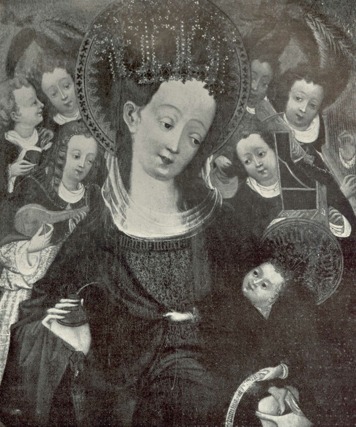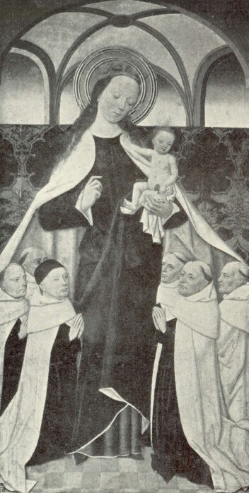 Firmenich-Richartz és az ő nyomán Aldenhoven a müncheni "Mária életét" ábrázoló festmények szerzőjének tulajdonít egy Madonnát (685. sz.), kinek leomló köpenye alatt két oldalt három-három térdelő dominikánus szerzetes talál oltalmat.2 A gyermekét karján tartó anya bolthajtásos csarnokban áll, melynek pillérei közé meggyszínű brokát függöny van kifeszítve. A drapéria felett kilátás nyílik a szabadba. A festmény bizonyára alkotójának utolsó korszakából való. A régi kölniekre leginkább az ábrázolás állapotszerűsége, a szer-tartásos, ünnepélyes elrendezés, a nyugodt kompozíció emlékeztet. A formák többnyire kölcsönözöttek és csak feldolgozásukban különböznek a németalföldiektől. A részletek szigorú megfigyelése már kiveszett belőlük és helyét a rajzolat ritmusának nyugodtsága, a legnagyobb síkok éreztetése foglalja el. Plasztikai hatásuk mérsékelt. Az alkalmazott színek egyszerűek, összeállításuk primitív. Mária zöld ruhát visel. Felemelt köntöse látni engedi meggyszínű alsó ruháját. Palástja fehér és alatta a dominikánusok öltözetei úgy érvényesülnek, mrnt egyszerű fekete foltok. Az épület belseje szintén fehér. Tagoló formái szürkék, a megvilágított részeken zöldesben, az árnyékokban vörösben játszók.