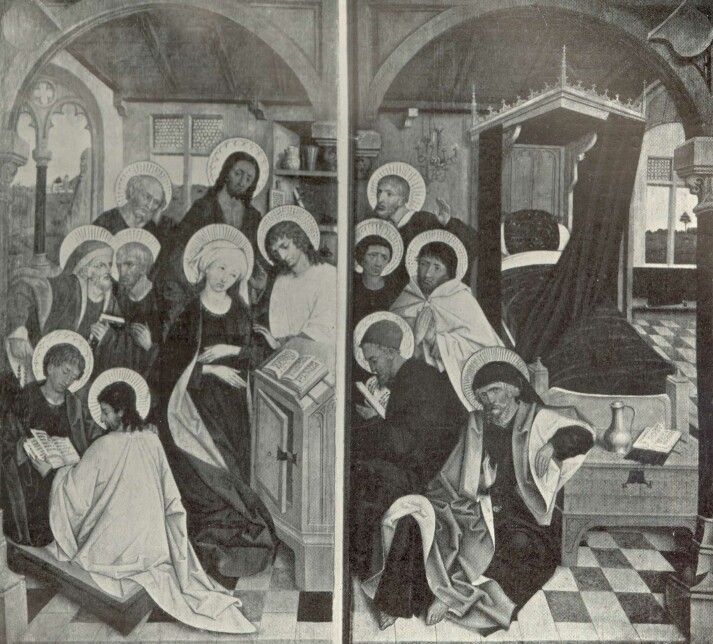 A tiefenbronni oltár predellájának hátsó részén két egyházatyának derékig ábrázolt képe látható.4 Ezen festmények stílusa közelebb áll a "Münsteri oltár"-éhoz, mint a tiefenbronni szárnyaké. Nemcsak alapformáik mutatnak nagyobb rokonságot az apostolok rajzával, hanem festői munkájuk is, amennyiben az képünkön megítélhető. A "Mária halála" is a szent püspökök képeihez hasonló prímafestés lehetett, barna tónusokkal, biztos és bátor ecsetvonásokkal. Erről bizonyosodhatunk meg legalább akkor, ha a művet közvetlen közelből, figyelmes szemmel vizsgáljuk.