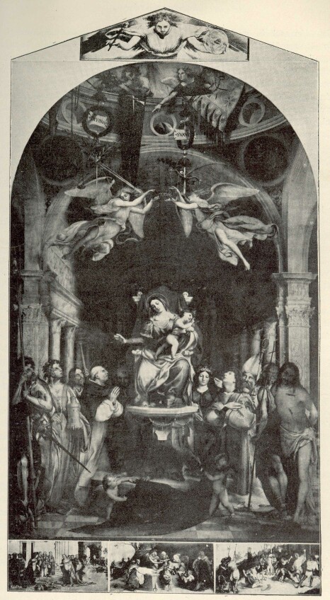 A mellékelt kép fölment minket attól, hogy hosszasabban ecseteljük ennek az oltárképnek pompáját. Az egek királynője íme leszállt a földre s ott trónol boldogan, körülvéve átszellemült, lelki elragadtatásba merült szentektől. Figyeljük csak meg a gazdagon terjeszkedő fehér márvány-architektúrát egész pompájában s díszében, festett medaillonképeivel, a szőnyegek, koszorúk és diadaljelvények dús egyvelegét, az ujjongó angyalokat és a negédes, elragadón szorgoskodó puttókat. Mily fejlődés ez két évtized alatt! Bellini csöndesen szenvtelen világa, vallásos érzésének biztos ünnepélyessége, Cima bensőséges jámborsága, a quattrocento egész jámbor kedélyessége le van győzve és az új művészet korlátait áttörve fölujjong hatalmas szenvedélyben és nagy lendülettel.