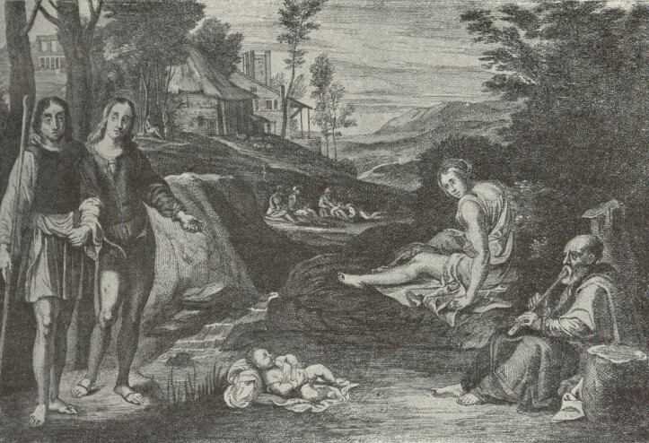 Hekuba egykor azt álmodta, hogy tüzet fog szülni, amely egész Tróját elpusztítja. Erre aztán kitették a gyermek Parist. Nézetem szerint a kép azt a mozzanatot mutatja, amidőn a nimfa és Pan által őrzött csecsemőt a pásztorok megtalálják. Erre nézve Cicero kompetens (De divinitate).