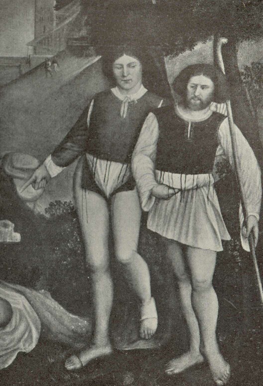 Vegyük ezeket sorjában. Morelli ezt írta:31 "Az olasz iskolákból való képekben gazdag pesti Esterházy-képtárnak van egy Giorgione-képe is, amelyről azonban azt hiszem, hogy csupán töredék. Két fiatal férfi, a XV. századbeli velencei öltözetben, mezítláb, tunyán áll egy dombon, mögöttük valamivel magasabban fekvő falusi ház. Hajnalodik s mesz-sziről látható a nap első sugaraitól megvillanó tenger (?). A két csinos férfi egyike bal karját a másiknak vállára támasztja s jelentőségteljesen mutat valamire, ami látszólag tőlük nem messze történik; a másik nagy-csodál-kozva, sőt ijedten tekint lefelé ugyanabba az irányba. Ha nem tévedek, így ez a kép talán töredéke Gioigione egyik művének, amelyet Morelli Anonymusa említ (Anonym pag. 65.) 1525-ből, a Casa de M. Taddeo Contarinó-ból: La tela del paese con el nascimento de Paris, con li dui pastori ritti in piede, fu de mano Zorzo de Castelfranco, e fu delle sue prime opere.