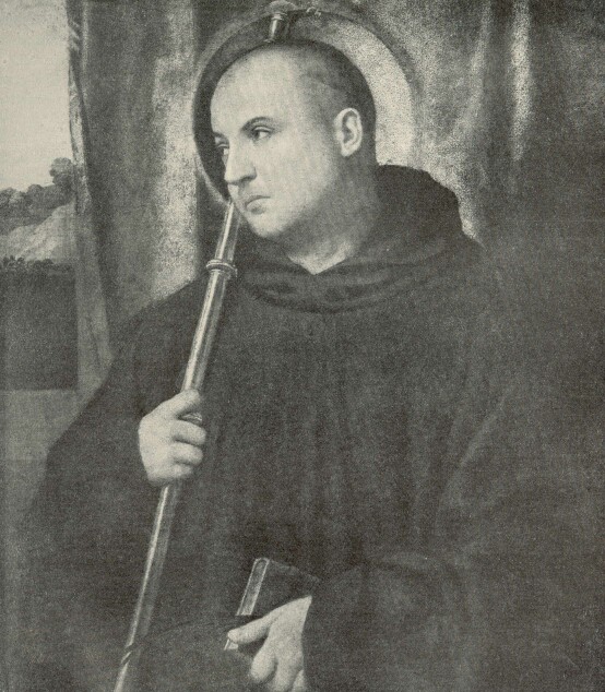 A fekete csuhás szent, jobbjában pásztorbottal, baljában könyvvel és pálmaággal, hiányos attribútuma révén nem határozható meg biztosan. Sz. Alajost jezsuita-csuhában kereszttel s liliommal a kezében szokták ábrázolni.12 Mivel az itt ábrázolt alak a jezsuita képét kelti, sz. Alajost vélték benne megpillanthatni, mert ez a szent kapta tizenhat éves korában azt a kinyilatkoztatást, hogy jezsuitává lesz. Szent Alajost azonban Moretto semmiképpen sem ábrázolhatta, mert a szent csak 1568-ban született, 1587-ben lépett be a jezsuita-rendbe s ifjan halt meg 1591 - ben felette jámbor élet után. Akkor, amidőn sz. Alajos (Lodovico Gonzaga) 1568-ban született, Moretto már több éve halott volt. Hogy a kép sz. Benedeket ábrázolja, mint azt mások hitték, szintén kétséges, mert a bresciai művészet tipikájában ez a szent szakállal s kopasz fejjel szerepel. Moretto maga is a bresciai S. Clemente-templom pompás főoltárképén szakállal s kopasz fejjel ábrázolja őt, s Romanino is, a benedek-rendiek páduai S. Giustina-kolostor templomának főoltárképén (most ugyanott a városi képtárban), hogy csak éppen a leghíresebb példákra hivatkozzam.
