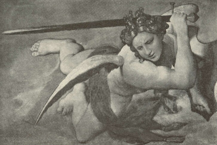 E mesterek közül minket első sorban Giov. Francesco Carotto érdekel, mert Pulszky a gyűjteményünk számára vásárolt szerzeményeket e mester egyik sajátkezű művével gazdagította. Ennek a 180. sz. a. kifüggesztett képnek tárgya Mihály arkangyal, pajzzsal és pallossal, röptében. Nem nehéz biztosan felismerni Carotto kezét az éles rajzon, a hús rőt téglaszinének érdességén, a hajcsomók jellemzetes fényén. Elénk tolul az a gondolat is, hogy ennek a képnek Carotto kései korából kellett származnia s hogy mostani formájában nyilván csak töredék. Ez az erélyesen, sőt viharosan eléröppenő alak oly sajátlagosan rosszul vág a keretbe, hogy önkéntelenül érezzük: itt hiányzik valami, ami világossá tenné s megmagyarázná, hogy miért ragadta pallosát ütésre. Az a körülmény, hogy a veronai képtárban van a Bernasconi gyűjteményéből származó hasonló képe Carottónak, amelyen az eléröppenő Mihály arkangyal a pokolba űzi Lucifert (az arkangyal a mi képünkön balról jobbfelé, a veronai képen jobbról balfelé röpül), továbbá hogy ennek szomszédságában van Carottónak még egy képe, Krisztus megkisértése, ezzel a felírással: vade Satana. S. C. R. Dominum Deum tuum adoro, arra a következtetésre juttathat minket, hogy Carotto Lucifer-ciklust festett, a melynek egyik darabja vagy töredéke a mi szt. Mihályunk is. Egy szerző,39 aki a veronai gyűjteményről írt s Carottónak e két képét idézi, úgy vélekedik, hogy ezek rafaeli forrnák hatása alatt keletkeztek. A mi katalógusunk viszont Ca-rottónál michelangelesco befolyásról beszél. Vajjon nem volna-e találóbb itt e vonatkozásban Giulio Romano nevét említeni? E művész, 1524-től fogva Federigo Gonzaga udvari festője Mantuában, fényes munkálkodást fejt ott ki. Sikereinek hatása alatt rendelte meg nála a veronai püspök a veronai dóm kupolája kifes-téséhez szükséges kartonokat 1529-ben. Carotto ügyet sem vetve a püspök haragjára, méltóságán alulinak tartotta, hogy e kartonok nyomán elkészítse a falfestményt, - - annak későbbi (1534) kivitele Torbidótól való,40 de e festmények groteszk mivolta bizonyítja, mily végzetessé váltak Giulio Romano szertelen-ségei és túlhajtásai e veronai művészre; s amit Carottónál Michelangelo befolyására vezetnek vissza, - - különben be nem bizonyítható feltevés" - - azt nézetem szerint a Verona közeli szomszédságában fáradhatlanul dolgozó római mester nyugtalan alakításai nagy sikerének rovására írhatjuk. Mi több, a mi szt. Mihályunk ugyancsak emlékeztet arra a repülő alakra, amely a mantuai kastélynak a trójai háborút ábrázoló freskóján látható, emlékeztet továbbá az ő Vulkánjára stb. Ez okból e kép keletkezési idejét Carotto (szül. 1470)41 munkálkodásának legkéseibb korszakába, 1530—1546 közé kell helyeznünk.