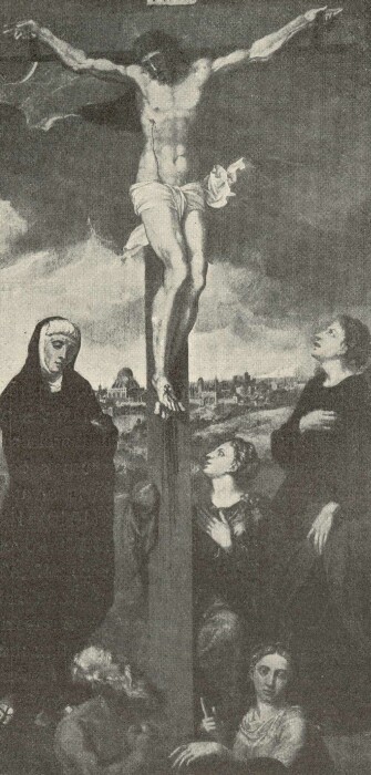 Egészen más eredményre jutunk, ha Brusasorcinak a veronai S. Fermoban levő Keresztrefeszítését vetjük egybe képünkkel. Mindenekelőtt magának Krisztusnak alakja meglehetősen egyező s bár a fájdalom kifejezése egyszerűbb : analóg az, hogy miként fogja át Magdolna a keresztfát. A lábak felette hasonlatosak, a nagy kezek is. Mégis habozunk, hogy magának Brusasorcinak attribuáltassék ez a mű. Domenico Brusasorci körvonalai biztosabbak, fejei elevenebbek, színe világosabb, egészben véve talán erőteljesebb és egyénibb.47 Ha e kép mégis az ő bélyegét viseli magán, úgy talán helyén lesz megfontolnunk, hogy a Brusasorci család művészcsalád volt. Fia Felice, annak öccse, Giambattista, sőt lánya, Cecília is hivatásos festők voltak.48 Felice Brusasorci (1540—1605) határozottan atyja előadási módját követte, mielőtt Ligozzihoz ment Firenzébe. Kivált a magasra megnyújtott alakok jellemzik őt. Talán nem téves a feltevés, hogy e Keresztrefeszítés szerzője, ha nem is épp Feliceben, úgy mégis e festőcsaládban keresendő.