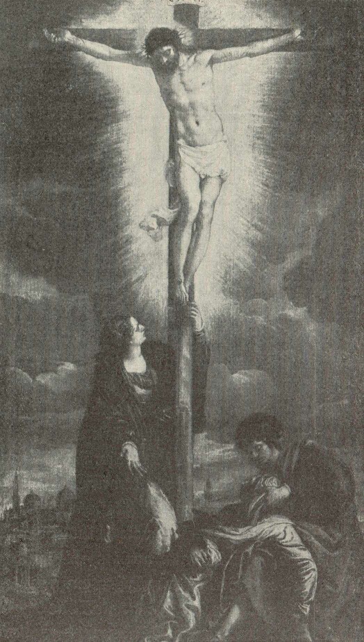 Sokkal inkább ehhez a Domenico Brusasorcihoz áll közel az Esterházy-gyűjteményből eredő 130. sz. kép, Krisztus a keresztfán, s nem Paolo Veronosehez, akinek legújabb katalógusunk, igaz, hogy ?-jellel enyhítve, tulajdonítja. Mert módunkban van Paolo Veronese azonos motívumain ad oculos demonstrálni, hogy Paolo Veronese másként érzett s másként értett a kifejezéshez. Épp az imént említett velencei S. Sebastiano-templomban, amelynek egész festői dísze csaknem kizárólag az ő műve, s amely az ő mauzóleumává is lett, a harmadik jobboldali oltáron látjuk a keresztrefeszített Krisztust a Máriákkal (fot. Naya 911), egy másik ily képét, kisebb méretűt, a drezdai képtár őrzi 231. sz. a. (fot. Bruckmann). Mily mesteri alakítóképességről tanúskodik mindkettőn az elragadón szép Magdolna-alak szivettépő kínjainak patetikus kifejezése, Paolo diagonális mozdulatmotivumaiban, tiszta, világos, átlátszó, finoman-ezüstös színeiben előadva! A mi képünk fölépítésében a függélyes elem uralkodik, az alakok megnyúltak, a kezek nagyok s kissé lapítottak, a lábujjak rajza hanyag, az alap pedig szürkészöld. Paolo Veronese alapja mindig világos, ami tiszta színeinek frisseséget és ma is kápráztató tónust kölcsönöz. Képein a kéz s láb szorgosabb előadású. De nem gondolhatunk Battista Zelottira sem,45 aki Paolo földije volt s munkatársa a treviso-vidéki Soranzo és Fanzolo-villák falainak festésénél. Hisz egyik műve, szintén Keresztrefeszítés, kész összehasonlító például kínálkozik. Ez a kép a párisi Louvreban van 1195. sz. a. (fot. Giraudon), ahol tévesen Paolo Veronesenek tulajdonítják.46 Dekorativ felfogású festmény, könnyed és élénk ecset műve.