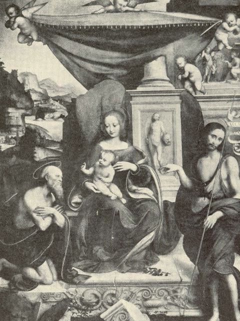 Megállapítható, hogy a kép eredetileg a Lodi-i dóm első kápolnájában volt elhelyezve, amely kápolnát mindenestül egy előkelő Lodi-i polgár adományozta, s a kápolnaadományozás 1508-as évszámából következtethetünk a festmény eredetének idejére is, holott ez adat nélkül talán inkább valamely koraibb időszakra gondolnánk. Az adományozó képmása, amelyet síremléke megőrzött, tökéletesen egyezik a képünkön látható donátorral, aki bensőséges odaadással térdel a gyermek Jézus előtt s ilyen módon őt Bassano da Ponte-vel azonosíthatjuk, sőt a donator képmásához készült vörös krétarajz - - amely elfenődött ugyan, de eredeti — ki is mutatható az Ambrosiana-ban (a régibb elrendezésben 1806-ig bekeretezve volt kiállítva). A képet Fumagalli körrajzban mutatta be művének XXIV. tábláján; az ő idejében, tehát mintegy száz évvel ezelőtt Sanquircio milánói polgár tulajdona volt, deszkára van festve, nagysága ugyanazon forrás szerint 193X147 centiméter.42 A hetvenes évek elején Baslini műkereskedő útján a pozsonyi főúr tulajdonába jutott és reprodukcióját módomban van közölni Pozzi-nak egy több mint harminc év előtt még Milanóban készült fényképe nyomán, Gustavo Frizzoni dr. előzékenységéből.