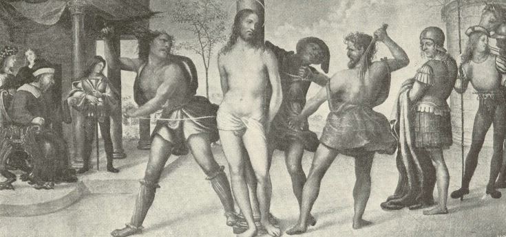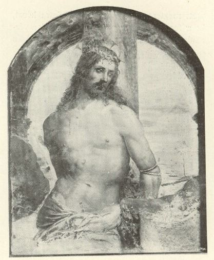 Krisztus töredékes képe, amelyet Lombardi nyomán reprodukálunk, egyike Sodoma híresb alakjainak. Javakorából való Sodoma-kép, amelyet alkotó ereje fáradság nélkül látszott megteremteni. Ami itt bámulatra készt, az a festői tehetség gazdagsága, amely a vér-tanúság extázisát oly behatóan adja elő.60 és érzésének az az értékes deleje, amely mindenkit hatalmasan megragad. Csekély távolság választja el a Megváltó arcát a mi kis predella-képünkétől, a felső test körvonalai tűrhetően egyeznek, alakjának szelíden hullámos vonalait a mi képünk nyomán rekonstruálhatjuk. A poroszlók csoportjának élénk mozgalmassága kontrasztjaival egyetemben korántsem michelangelesco hajlandóságokból eredt, amelyektől Sodoma egész életén át nem engedte magát zavartatni, mindez inkább megannyi emlék ama kilenc monte-olivetói lunetta freskóiból, amelyeken Luca Signorelli is ábrázolt hasonló mozgalmas alakokat, lanclsknechteket és Totila katonáit. Az alakok olykoi elég rosszul állanak a talajon, ami gyakori eset Sodomá-nál. A szín élénk, az árnyékok átlátszók, mint javakorából eredő képein, míg a kései időből származó festményein, az árnyékok nagyon megsötétedtek.