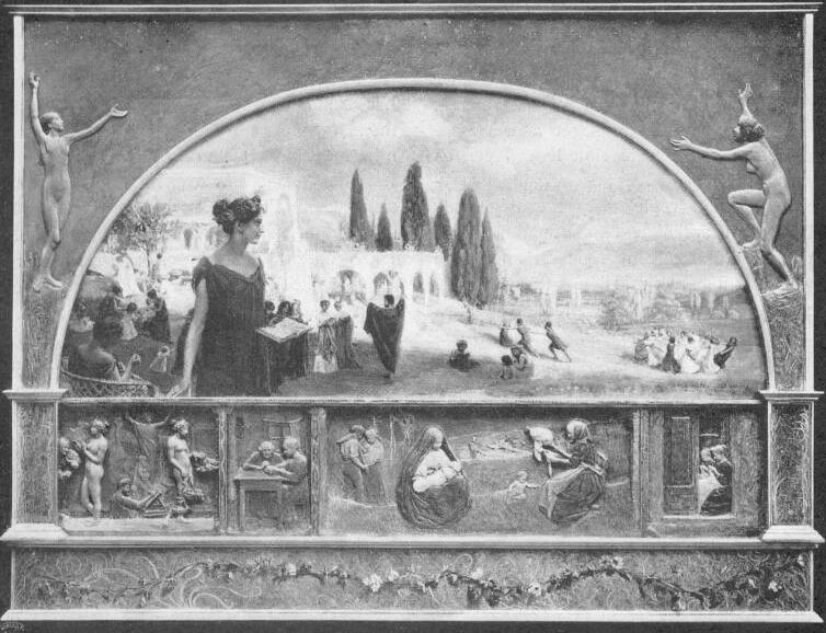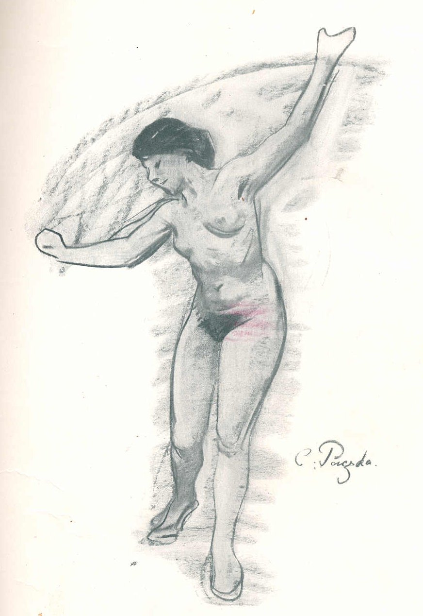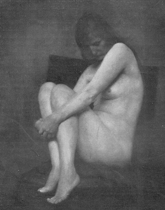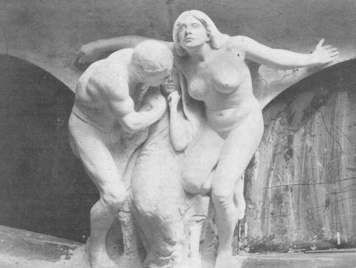 A művésznő harmadszor is nekifogott ennek az egész lényét betöltő problémának a megoldásához, amikor egy óriási csészeformájú kutat tervezett, amelynek gazdag, plasztikus díszítésében akarta tisztultan kifejezésre juttatni azt, ami a képzeletében előtte lebegett. A szobrászat technikája úgylátszik semmi nehézséget sem okozott neki. Nem kellett küzdenie vele, mint a színnel. Persze egy mélyértelmű alkotásról van szó. És sok esztendő komoly munkájáról. A kút bronzban van gondolva. A minta gipszből van. És az alakokat — mint a kép mutatja — a művésznő a keménynyé vált gipszből akarja kifaragni. Ez, a kényelmes, agyagból való mintázással szemben, elragadó üdeséget, élességet és tökéletességet kölcsönöz neki. A hat dombormű közül, mely a kutat, annak a festett sorozatnak megfelelően, díszíteni hivatva lesz, az egyiket, mely részben már készen van és körülbelül egy méter széles lesz, a "Chaos"-t, képben is bemutatjuk olvasóinknak. Dante-szerű, látnoki fantáziával mutatja be ezen a művésznő előttünk ember-tömegek táncát, az emberi nemnek szemeink előtt felvonuló, szinte beláthatatlan vonulását: mint felhők gomolyognak a csoportok, szélvész kap bele a nagy kavarodásba, mint ködszalag vész bele a tömeg hullámzása a végtelenbe. Szinte álomszerű az egész, mintha egy egész világnak vágyakozása, epedése és sóhajtozása volna! Ez az összbenyomás. De az élesebben fürkésző szem legnagyobb meglepetésére, fölfedezi, hogy ez a látszólagos "Chaos" a legszabatosabban kidolgozott egyes tanulmányokból van összerakva, amelyek ott pihennek a művésznő mappájában, s amelyek közül egy ceruzarajzot olvasóinknak is bemutatunk. A motívumoknak szinte beláthatatlan gazdagsága tárul elénk. És én nem habozom kijelenteni, hogy ez a dombormű, mely persze megint csak egy része a nagy egésznek, előttem a legtökéletesebbnek látszik, amit csak a művésznő eddig alkotott. És elsősorban az indít engem erre az ítéletre, hogy itt elérve látom azt is, amit -mint fönnebb említettem — a művésznő mint fődolgot kíván szerepeltetni. Adja Isten, hogy ez a hatalmas alkotás necsak a minduntalan visszatérő gondoknak forrása legyen a művésznőre nézve, hanem egyúttal az erő forrása is, jobban mondva, az "Élet kútja", amelyben a képzelete és magasan szárnyaló elszántsága állandóan megifjodhassék.