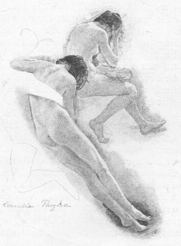 Paczka Cornelia művészi pályája ettől fogva bár emelkedő vonalban, de nem egységes úton fejlődik. Eleinte inkább grafikával, később inkább festéssel foglalkozott, sőt az utóbbi években a plasztikával is megpróbálkozott. De azért törekvését és alkotását a maga egészében egy közös alaphajlandóság tartja össze. A grafika, a festés és a plasztika úgyszólván csak azok a szervek, amelyeknek a segítségével iparkodik művészi hatalmába keríteni azt a kincset, amely ifjúságától fogva szorongva és a napvilágra kívánkozva él a lelkében. "Én - - mondja a művésznő szenvedélyes hangsúllyal magáról erős (és nem gyöngécske) forma-tartalmat hordozok magamban és azért küzdők, hogy életet öntsek bele, amit majd rajzolással (grafikusan), majd festéssel (képben), majd plasztikusan próbálok meg; alapjában véve ez mindig ugyanaz: egy lelki forma-tartalom, egy nekem látható neme az igazságnak, de nem "gondolat-művészet", nem alakokba áttett szógondolat. Ezek kifejezési dolgok, kifejezése egy színről-színre látott igazságnak, amely után én minden irányban való végtelen nehézségek közt iparkodom, valami, ami bennem él, örök s amit nem elegendő tudásom ellenére is ki szeretnék hozni, ami bennem valami egységessé alakult, és amit mindig, mint az én legfőbb dolgomat érzek." Egy művésznő, aki azt tudja, amit Paczka Kornélia tud, aki különösen a rajz és a szobrászat terén az eszközöknek és mindannak, a mit a legtágabb értelemben technikának nevezünk, ura, még pedig annyira souverain módon ura, mint alig van még egy másik az élő művésznők közül, egy ilyen művésznő, amikor lelki titkának a zárait fel akarja pattantam előttünk, tán beszélhet "elégtelen tudásról" anélkül, hogy őt a félreértés veszedelme fenyegetné. Én azt hiszem - - és ezt a szavai is mondják, az alkotásai is bizonyítják, - hogy éppen a túlhatalmas képzelettel és kedéllyel teljes fiatalkori koncepciók azok, amelyeket még eddig nem sikerült a maga énjéről teljesen, összhangzatos és művészi módon lehámoznia. És miután ő maga igy rámutat a "fődolog"-ra, arra a nagy és egyetlen célra, amely előtte lebeg és amelynek elérésére pihenés nélkül törekszik, ám kíséreljük meg, egyelőre akár az ő eszményképének a figyelmen kívül hagyásával is, azokat az étapé-okat meglátni, amelyeken meredek útja közben áthaladt, úgyszintén azt a sok szépet és pompásat, ami úgy "mellékesen" az útszélen elhullott.