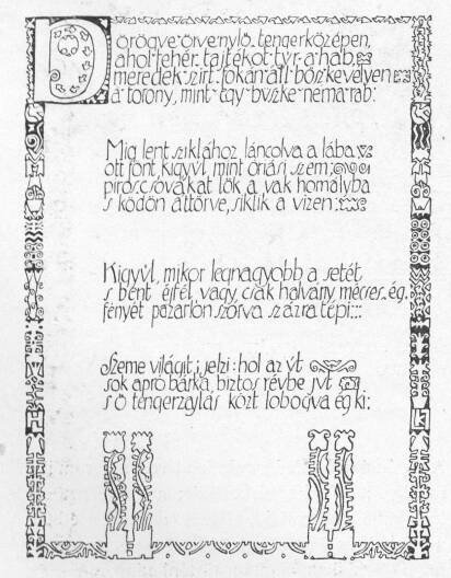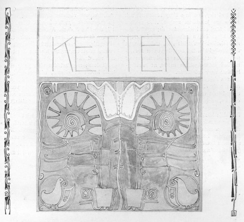 Lesznek néhányan, akik első látásra hasonlóságot keresnek az itt közölt könyvdíszek és hasonló környezetben megfordult festő ismert munkái között. Ezzel a véleménnyel nekem természetesen számolnom kell és állítom azt, hogy különbség van piktorgrafika meg építészgrafika között. Az előbbi - - ha szimbolikus is - - változatlanul átvevén a természet allâtes növényvilágának jelenségeit, mindig csak rajz marad, míg ezek a díszek a természeti jelenségek elemekre való bontásai, szerves ornamentumok, s bizonyos mértékű merevségük is onnan ered, hogy az anyagba beolvadhassanak. Az első művész alkotásainak kifejezője a toll, a tű, emezé minden anyag, mely formát öltve, színben, arányban, a díszítés új összefoglalásmódjában hozzánk beszél, a mi életünkhöz akar tartozni.