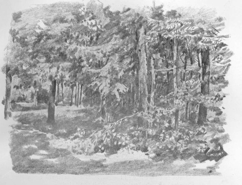 Békés nyaralóhelyén készült e finom rézkarc. A kivilágított ablaka házban, a bokrok sűrűjében és a hold előtt vonuló fellegek tömegében mindenütt érezhető a formák biztos felépítése. Az egész életét zajtalan munkában töltött művésznek tartalmas egyéniségét semmi sem jelképezhetné jobban. Lelkülete és művészete oly összhangban állottak, aminőt csak az övéhez hasonló fegyelmezett-ségű karakterrel lehet elérni.