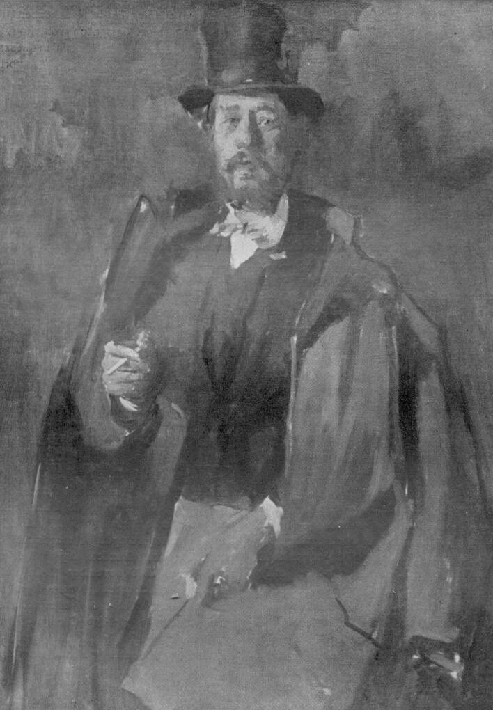 Leibl főleg biztos tónusegységéért s ez egység végtelen differenciálódott voltáért rajongott, a biztonságért, melylyel meglátott, felfogott és azonnal vásznára tett minden formaárnyalatot, melyet főleg akt-festése közben figyelhetett meg. Most ő is azon volt, hogy szemét és kezét erre a határtalan készségre gyakorolja be. Barátait egyre-másra portraiti-rozta. így készült Szinyei-Merse arckép vázlata is,54 egy egységes nagy vízió, hirtelen felfogva, gyorsan letéve, széles, de rövidre vágott ecsettel festve, a barnás okker-bitüm-alapba feltéve a formákat, csak itt-ott éreztetve a lokális színeket, a fekete cilindert, a szürke kabátot, egyébként csakis a jellemet, a testtartást, a karaktert keresve. A vázlatról természetesen hiányzik még a tónusok lágy nyugalma, a végső finomság, de karakteréreztetés szempontjából, tökéletes. Igaza van Göthének: "A nagy művész alkotása minden állapotában kész".
