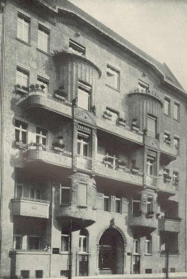 A művészi bérház első törekvéseit Gessner Albert érdekes, színes népmotivumokkal tar-kázott bérházai képviselték. A népi formák mélyenjáró, egészséges átérzéséről és igen ügyes, praktikus alkalmazásáról tanúskodnak ; noha merész alapszínük inkább papirra, mint az utca levegőjébe való. A berlini bérház problémájának megoldásához azonban nem igen járultak hozzá ezek a különben artisztikus házak, mivelhogy a szükséglet parancsaitól függetlenül, szinte magánházszámba épültek s ehhez képest eredményeik is magánház eredményei. Gessner ugyanis önmagának építette bérházait, nem eladásra és nem vállalkozó számára s így nem adhatott példát azoknak az építészeknek, akik nincsenek ilyen művésznek kívánatos helyzetben, akik a vállalkozó üzleti igényeinek zátonyai között kénytelenek a művészi megoldás útját keresni.